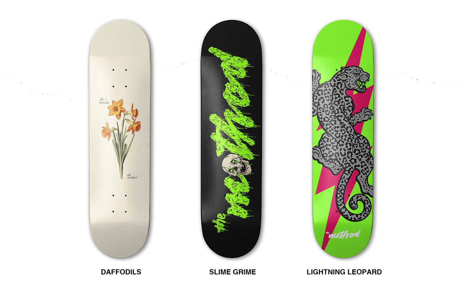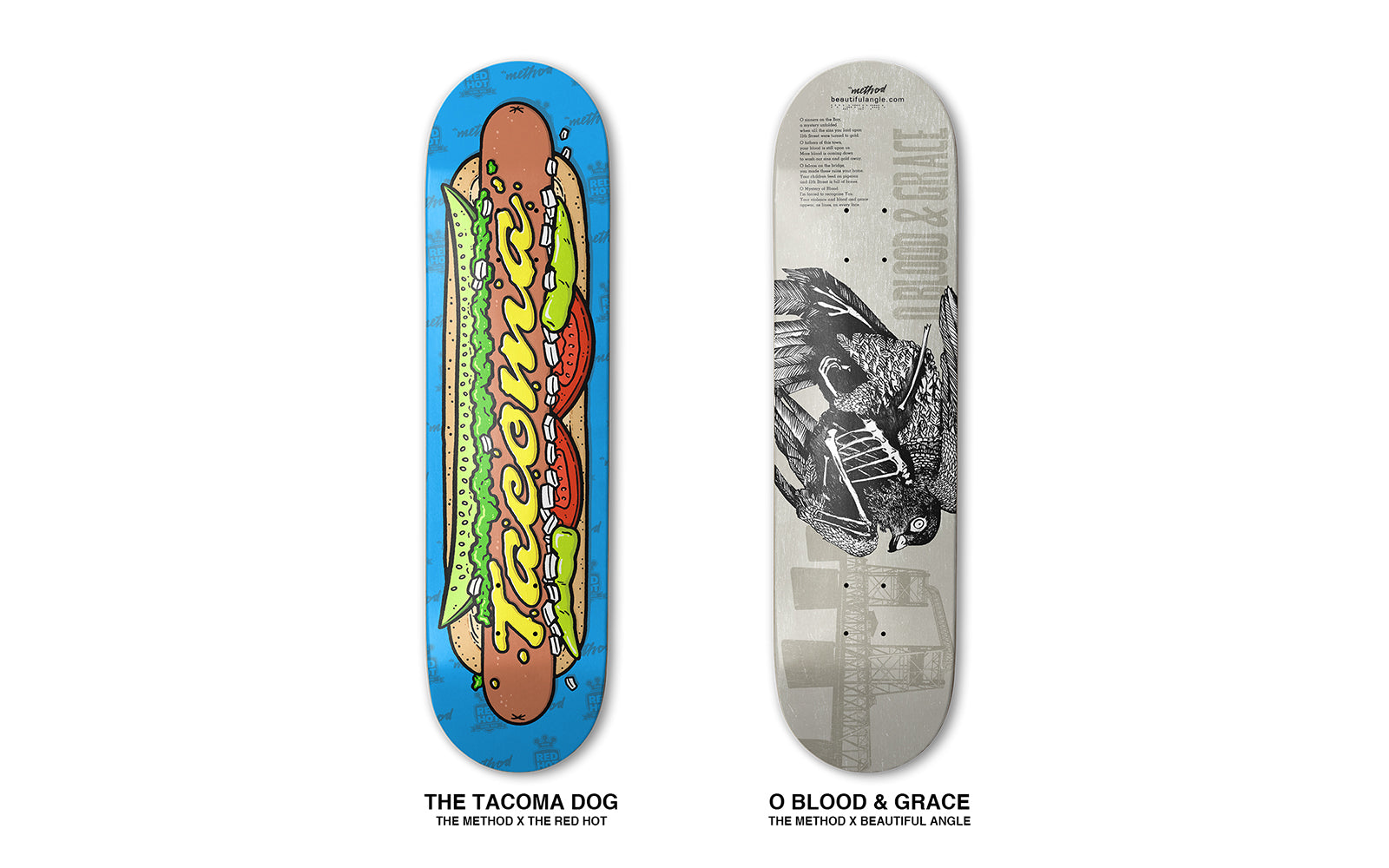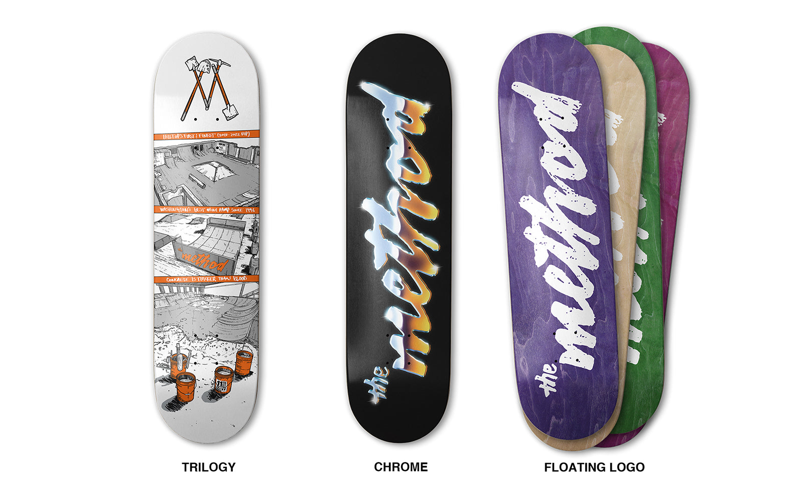 The Method skateboards are available in-store only at our downtown Tacoma location. Visit the shop at 822 Court A. Tacoma, WA.